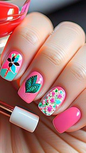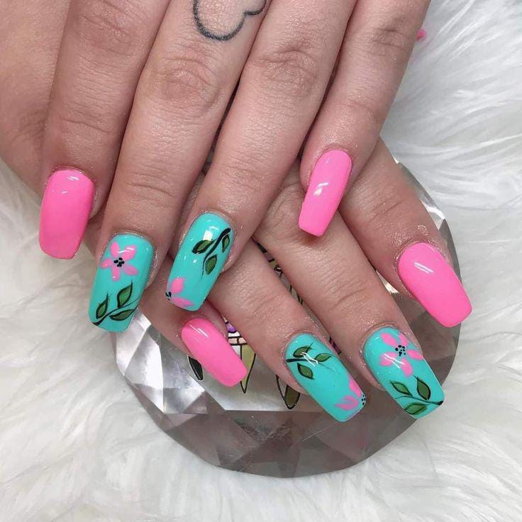 Bright pink and turquoise gel nails are combined with floral and green leaves-inspired art. The design looks playful, colorful, and full of cute spring energy.