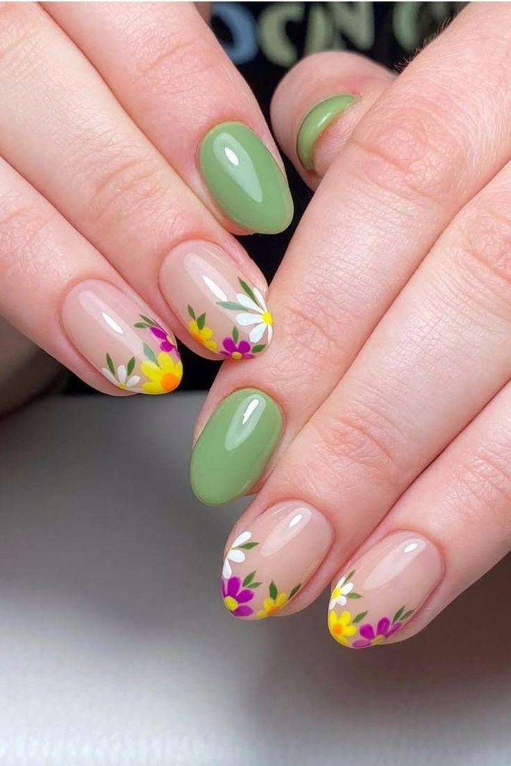 Soft nude and sage green gel nails are paired with tiny hand-painted flowers near the tip for a fresh and cute spring look. The design feels light, natural, and cheerful.