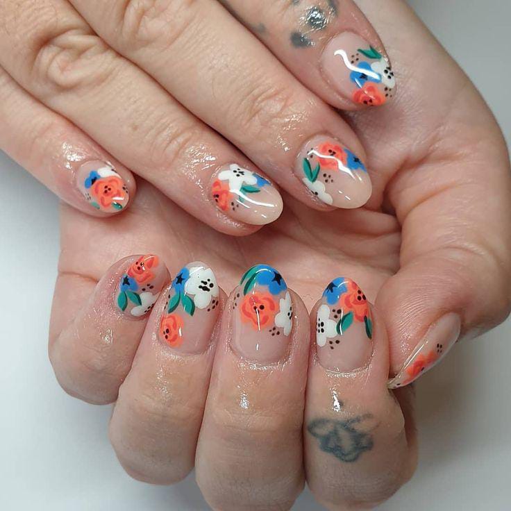 A sheer nude gel base is decorated with bright coral, blue, and white floral accents. The overall vibe is fun, artistic, and perfect for cute sunny spring days.