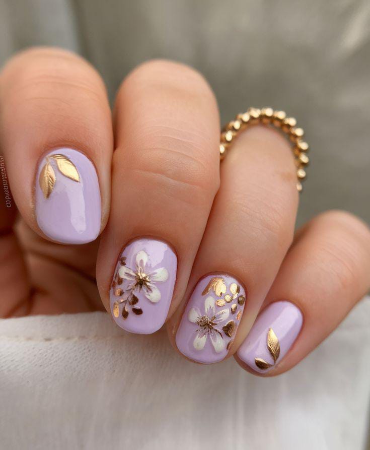 Pastel lavender gel nails are enhanced with white flowers and subtle gold foil touches. The look is elegant, calm, and slightly luxurious for spring.