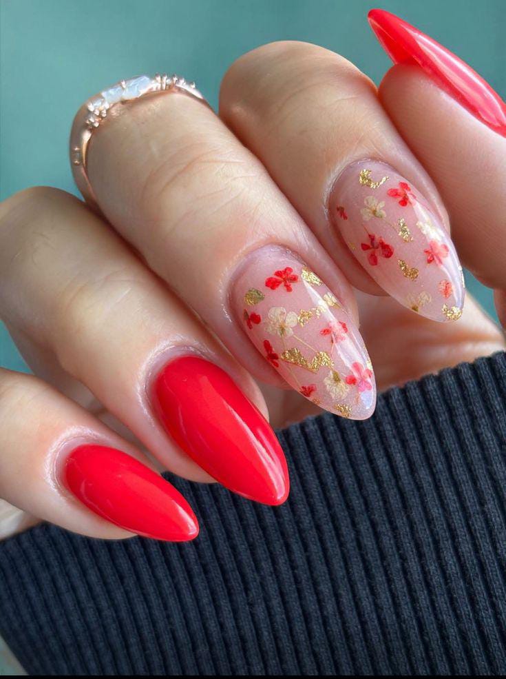 These nails mix bold red gel with clear accents filled with tiny floral details and gold flakes. The style feels classy yet soft, balancing cute with a modern spring touch.