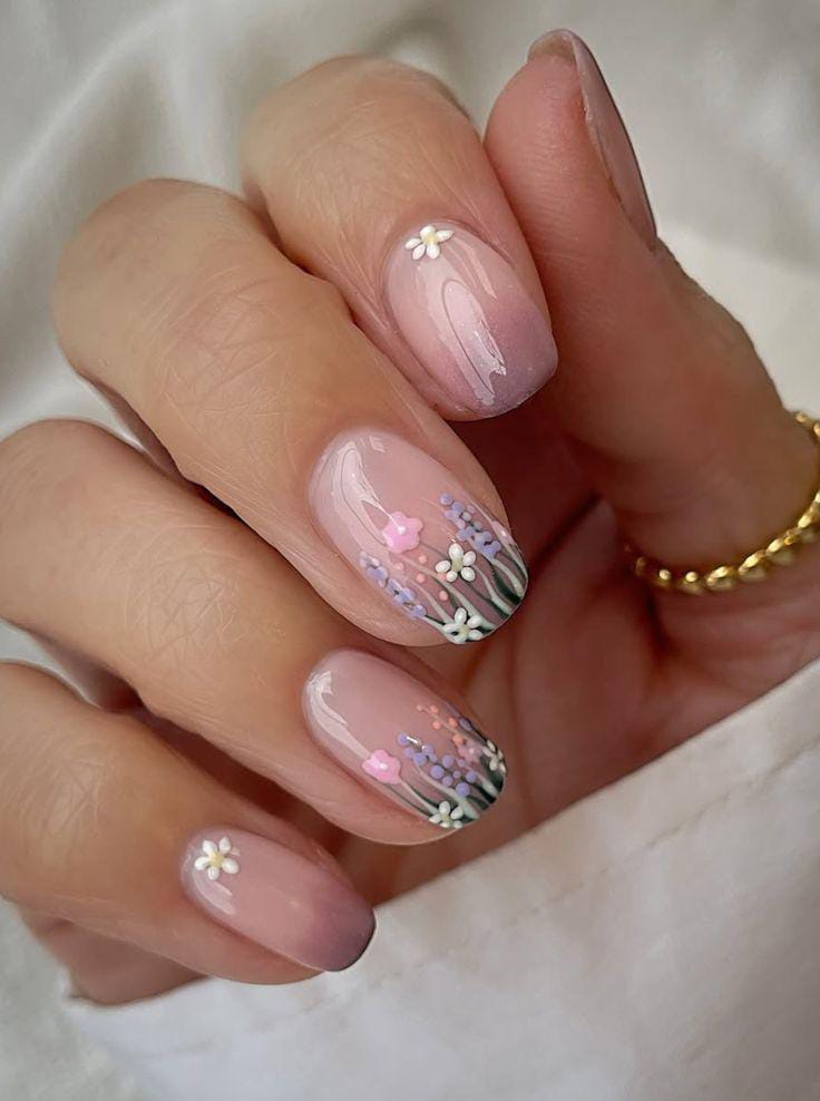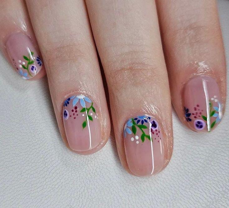 A sheer blush gel base features small hand-painted wildflowers in blue, green, and purple shades. It looks simple, elegant, and naturally cute for spring.