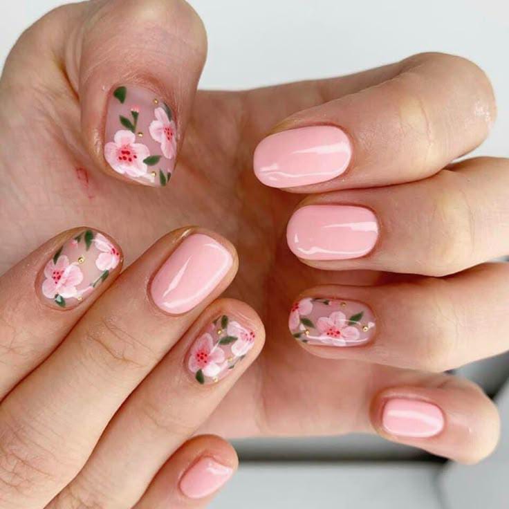 A glossy baby-pink gel base is paired with soft floral accents on a few nails. The design is cute, feminine, and perfect for everyday spring wear.