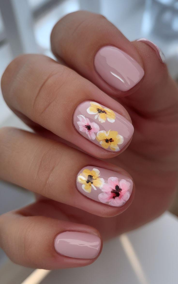 Muted pink gel nails are highlighted with hand-painted yellow and blush flowers. The overall style is gentle, cute, and subtly playful spring aesthetic.