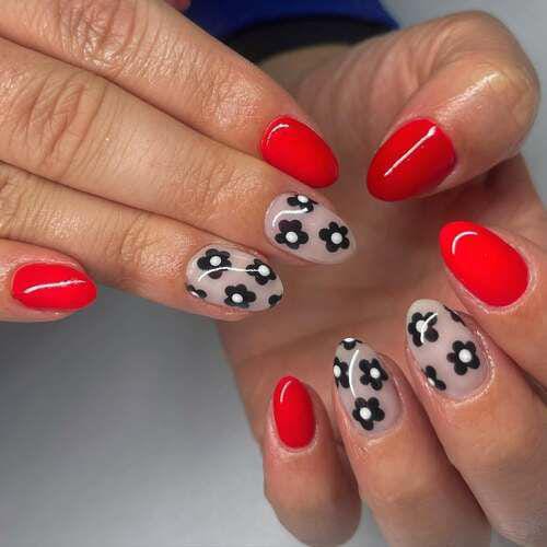 Vibrant red gel nails are balanced with nude accent nails decorated in black floral patterns. The design feels modern, cute, and slightly retro spring look.