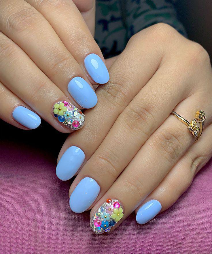 Soft baby blue gel nails give a clean spring look, while the accent nails are covered in colorful floral gems. The overall vibe is fresh, playful, cute and slightly glamorous.