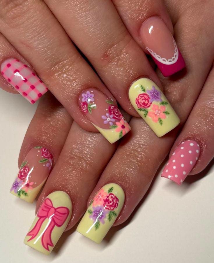 This design mixes pastel yellow and pink french tip gel nails with hand-painted flowers, polka dots, and cute bow details. It feels cheerful, vintage-inspired, and perfect for spring days.