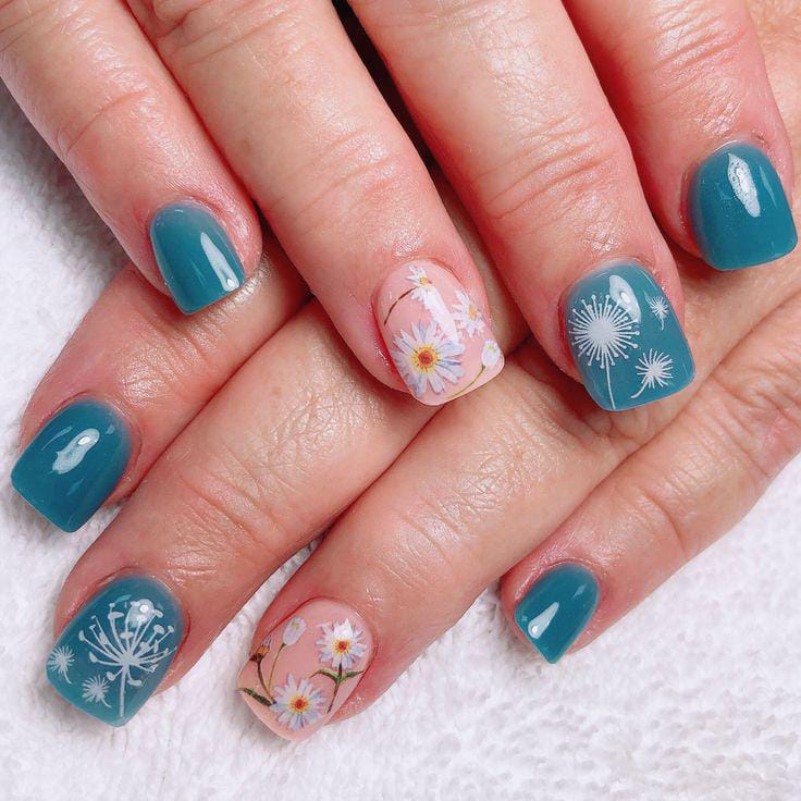 Deep teal gel nails are paired with delicate white daisy art on clear accent nails. The look is cute, floral, and inspired by nature’s spring mood.