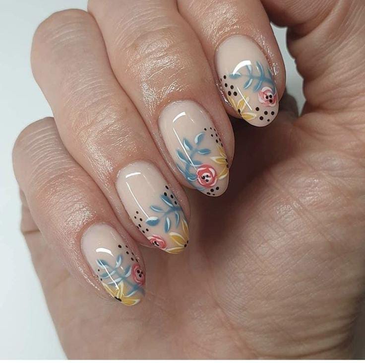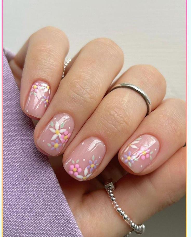 A creamy nude gel base is paired with delicate pastel flowers and leafy details. The soft colors give this design a light, romantic and cute spring feel.