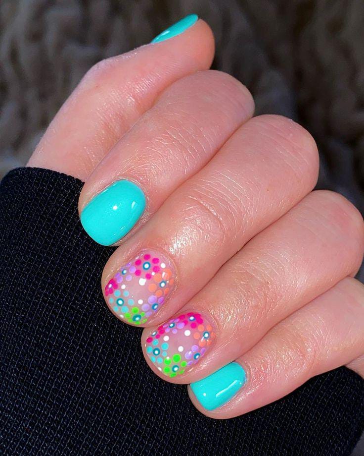 This design combines glossy blue gel nails with a clear base decorated in colorful confetti floral dots. It gives a fun, bubbly, and carefree cute springtime vibe.