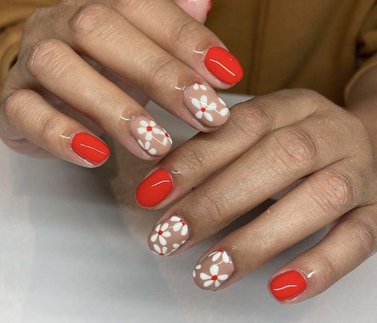 Bright coral gel nails are balanced with nude accents featuring bold white floral patterns. The design feels cute, modern, and full of spring energy.