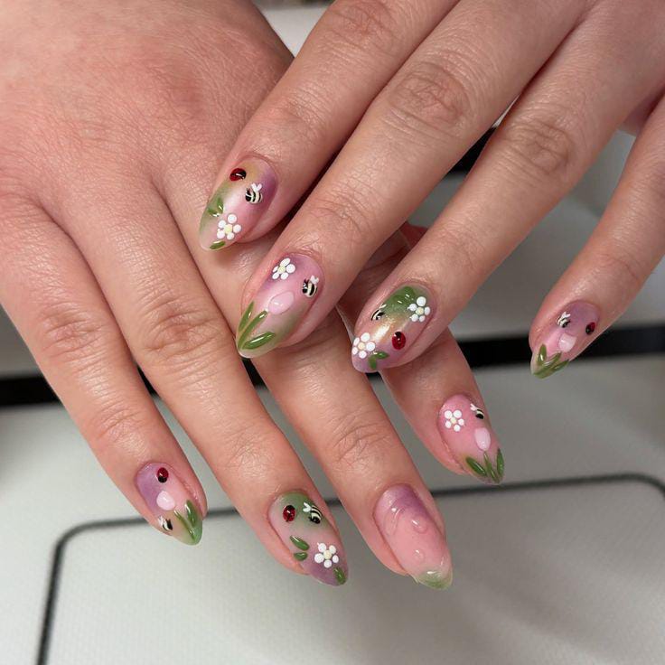 A sheer pink gel base with tiny flowers, leaves, and ladybug accents gives this set a playful cute garden vibe. It feels cheerful, natural, and inspired by early spring mornings.