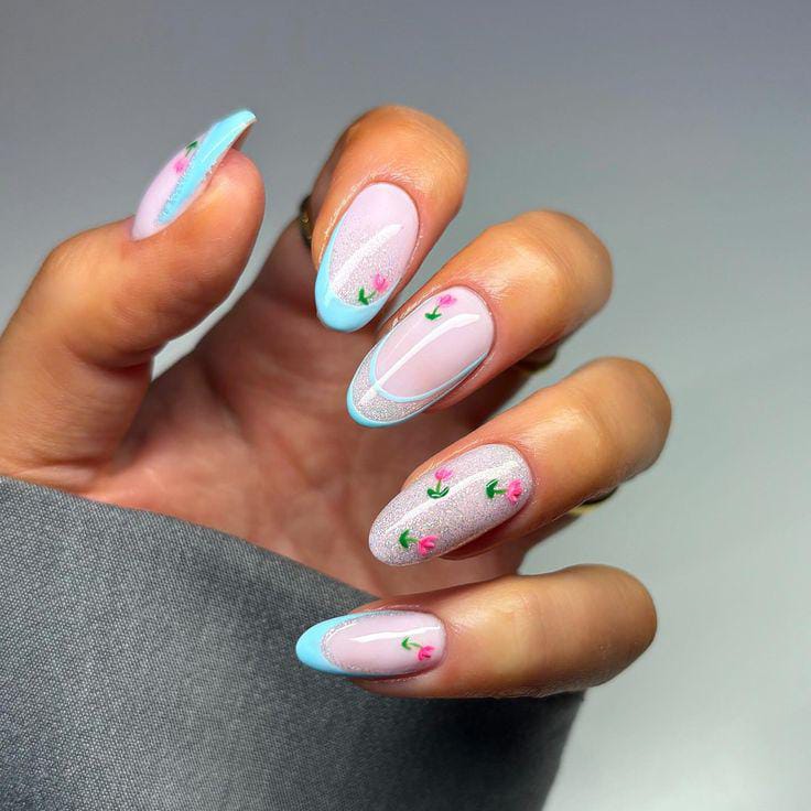 Pastel pink and teal gel shades are mixed with minimal tulip art and subtle glitter details. The design feels cute, balanced, and perfect for a polished spring manicure.