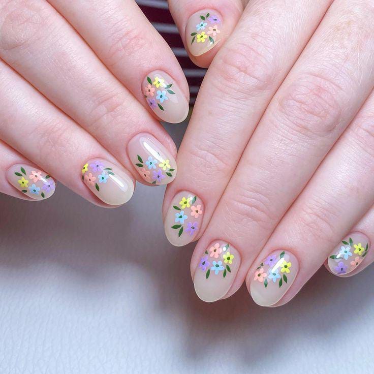 A sheer pink gel base is decorated with tiny pastel flowers scattered across the nails. The style is subtle, sweet, and a very feminine spring aesthetic.