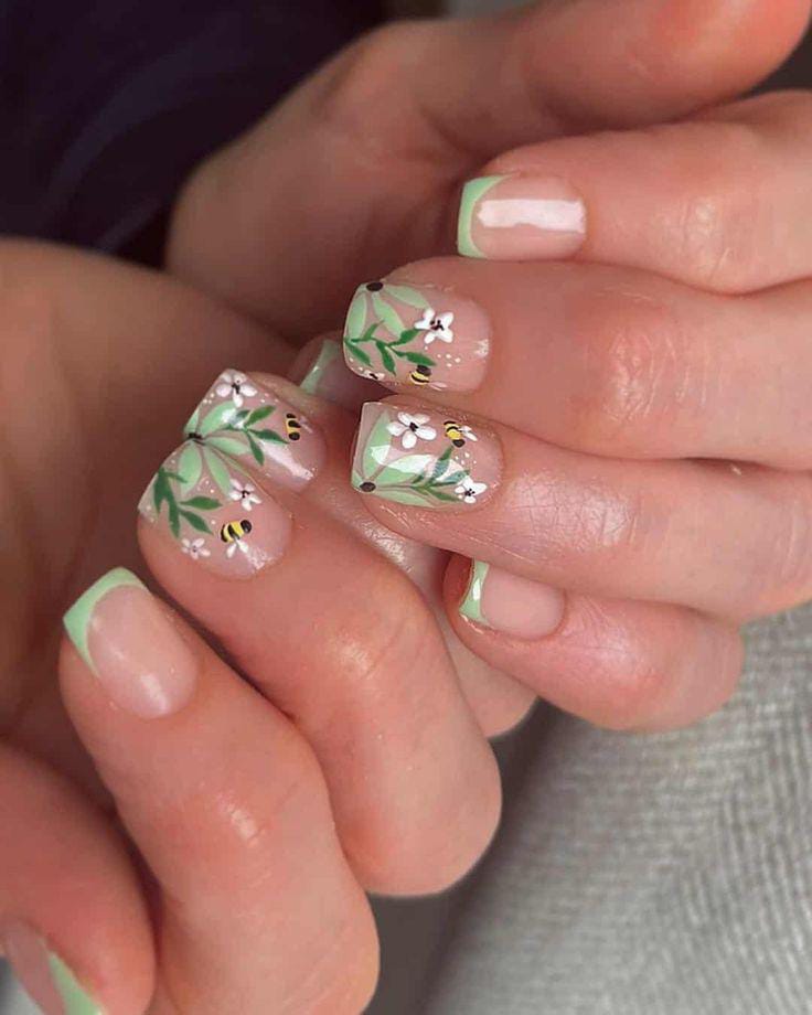 Soft nude gel nails with mint green tips, tiny blossoms, and bee accents create a cute nature-inspired look. The design feels fun, fresh, and full of spring energy.