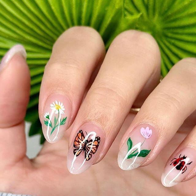 Clear and milky nude gel nails are decorated with delicate flowers, ladybug and a soft butterfly accent. The look feels light, airy, and elegant, like a cute spring morning.