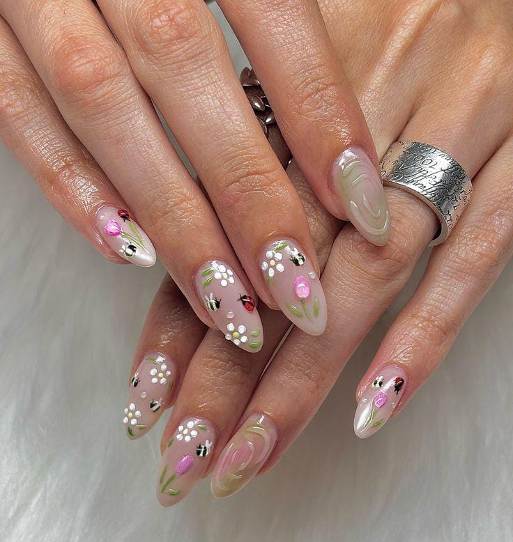 These gel nails feature a sheer nude gel base with small hand-painted flowers, ladybug and subtle pearl-like accents. The design feels romantic, feminine, and a gently cute spring feel.