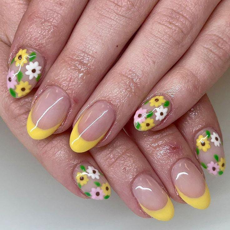 A pastel yellow French tip is paired with simple floral art on a nude gel base. The style is cheerful, cute, and perfect for a bright spring mood.