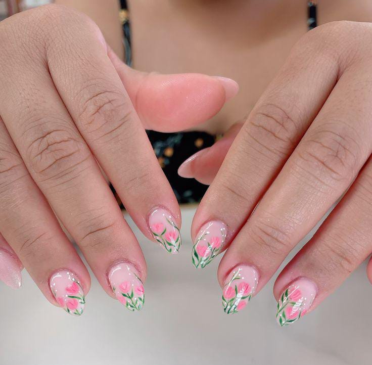 These nails combine a sheer pink gel base with delicate floral French tips and hand-painted tulip details. The overall style is elegant, feminine, cute and softly romantic for spring.