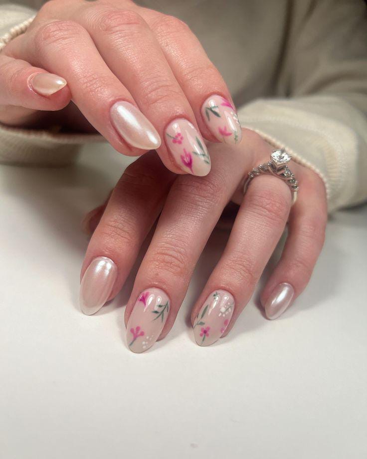 A nude gel base mixed with pearly shimmer nails and subtle floral details gives a cute, romantic feel. The design looks soft, polished, and effortlessly classy spring.