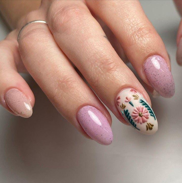 Muted lavender gel nails with a detailed floral accent nail bring a calm yet cute spring mood. The mix of speckles and floral art adds gentle character without feeling busy.