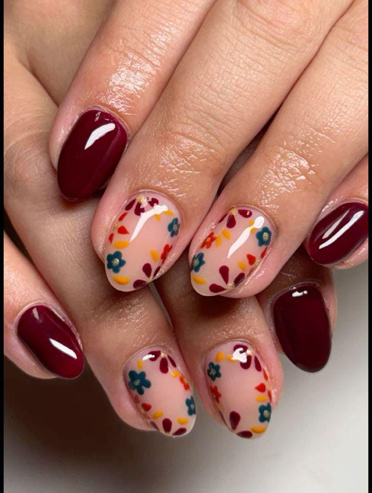 Deep burgundy gel nails are balanced with nude nails featuring colorful floral patterns. The contrast makes the design bold, fun, and perfect for a lively spring look.
