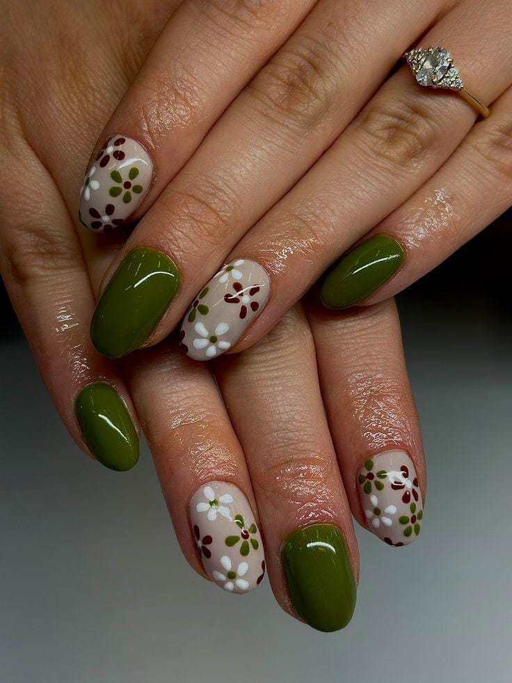 This design mixes deep olive green gel nails with soft nude bases and tiny floral accents. The overall look feels fresh, earthy, cute and perfect for early spring.