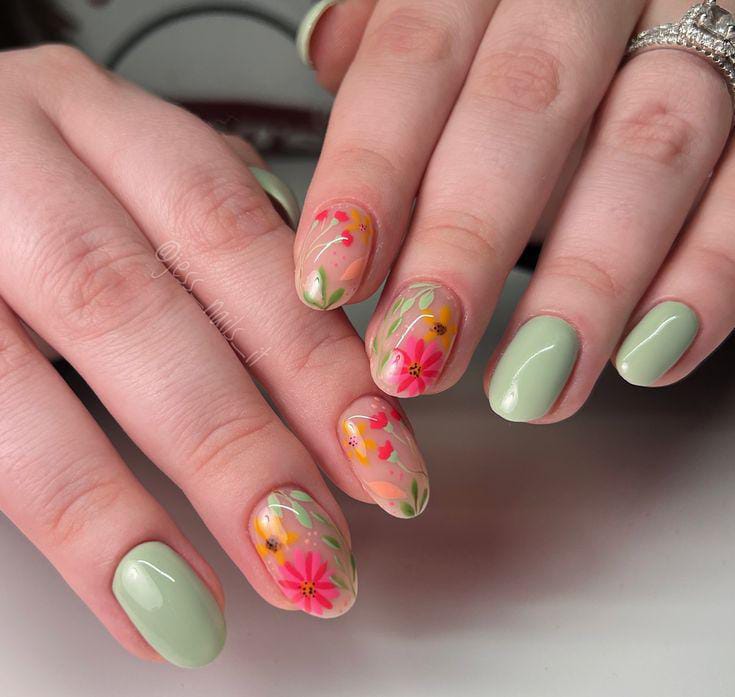 Mint green gel nails are balanced with transparent floral art in pink and yellow tones. The design feels playful, cheerful, cute and very spring-inspired.