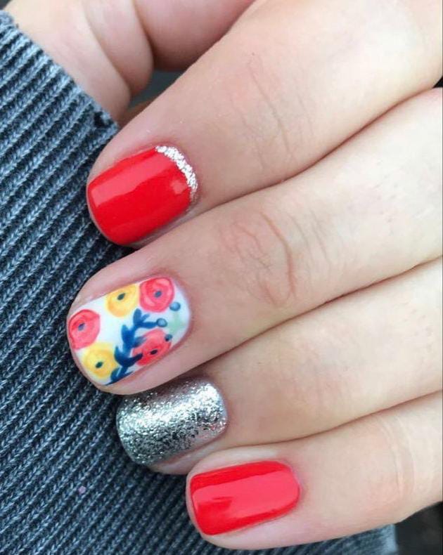 Bold red gel nails are paired with a floral accent nail and a touch of silver sparkle. The mix feels cute, fun, and perfect for a vibrant spring look.