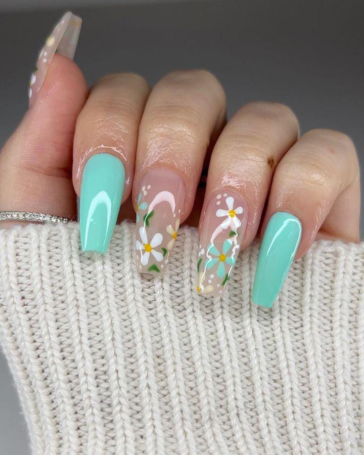 This look combines glossy mint nails with transparent accents decorated with white daisies. It feels cute, fresh, and very spring-inspired with a soft feminine touch.