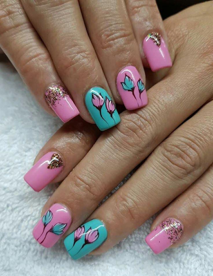 Bright pink and turquoise gel nails are paired with simple floral accents for a playful spring style. The colors feel fresh, cheerful, and cute without being overwhelming.