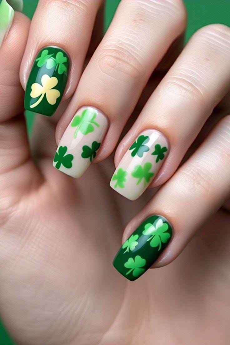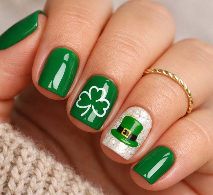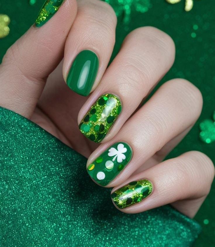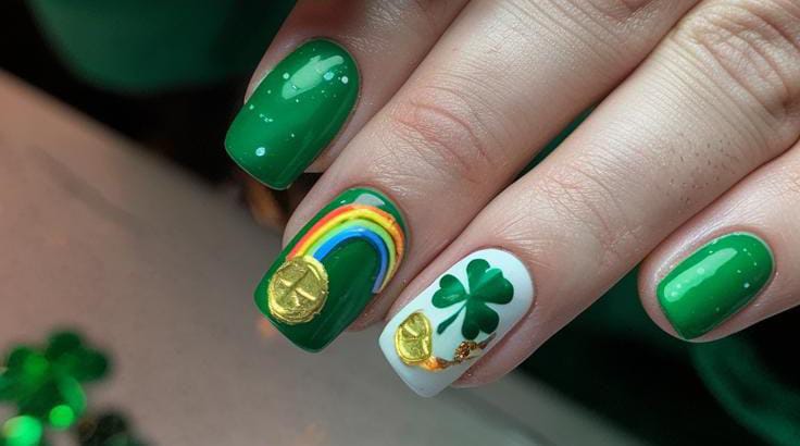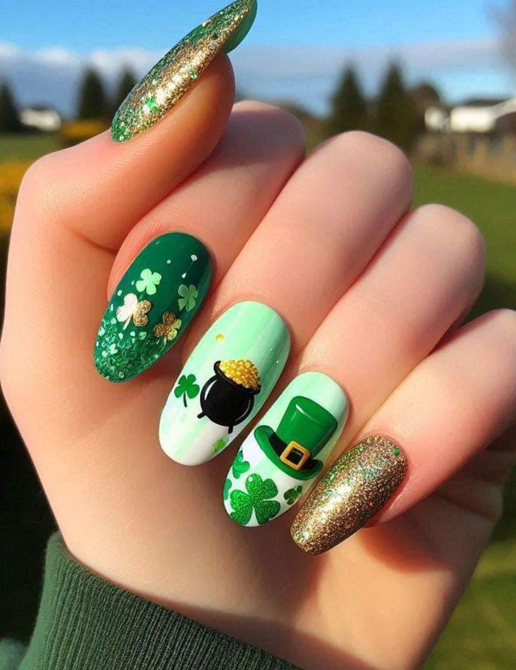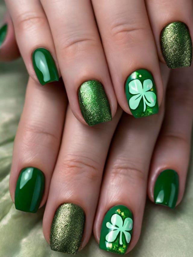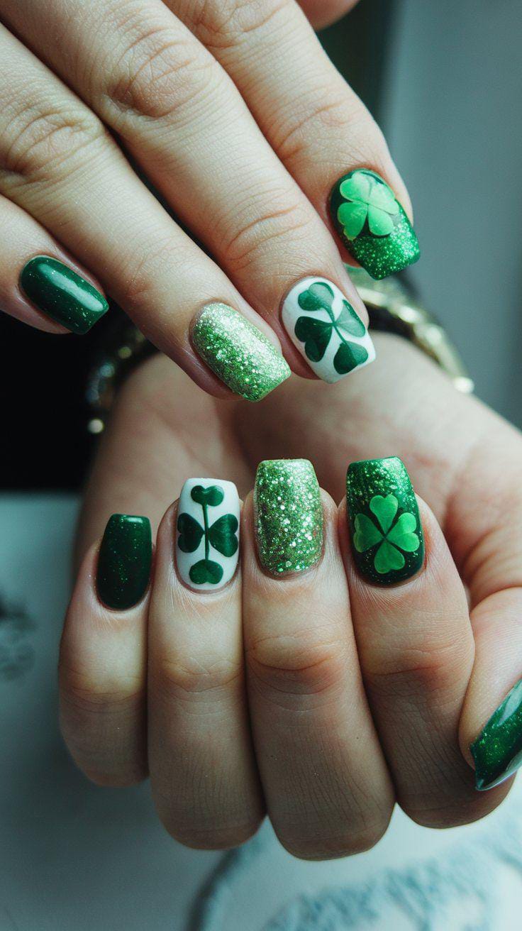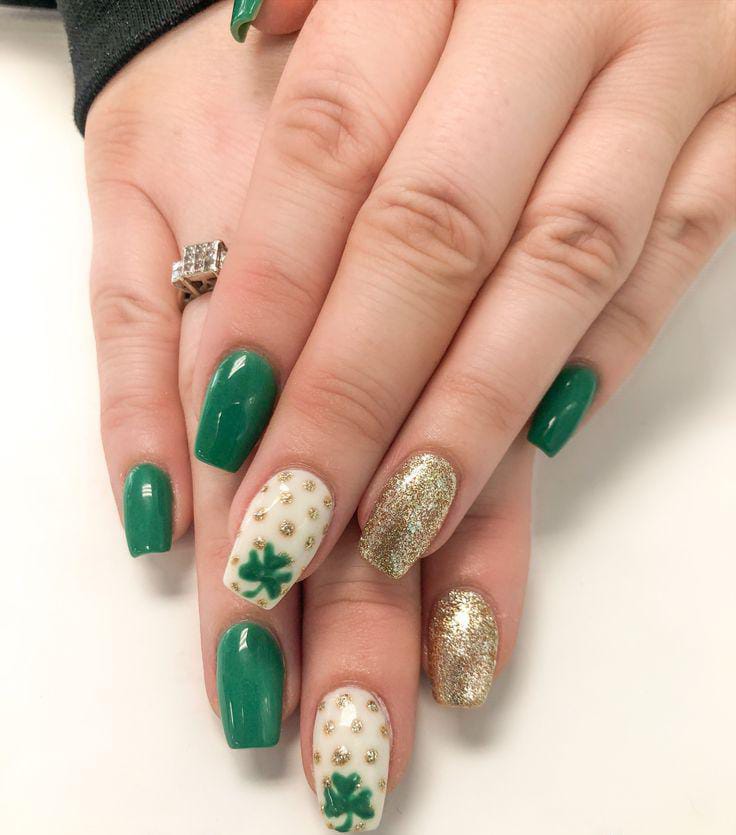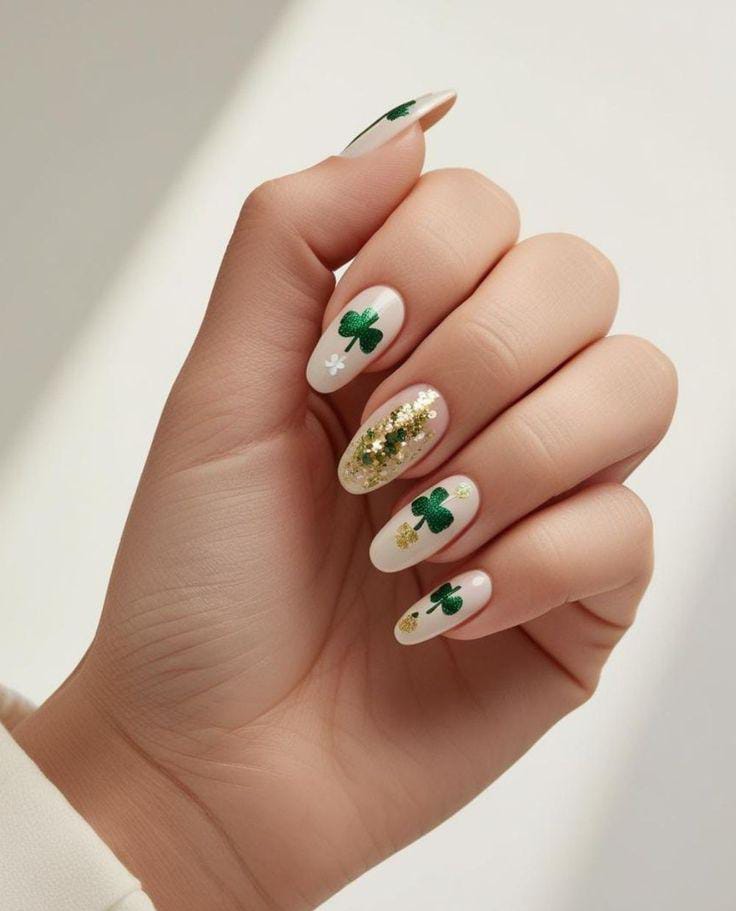 Deep green nails are mixed with gold glitter and simple clover cream accents for a timeless festive look. The clean color combo makes this design feel elegant while still clearly St. Patrick’s Day–inspired.