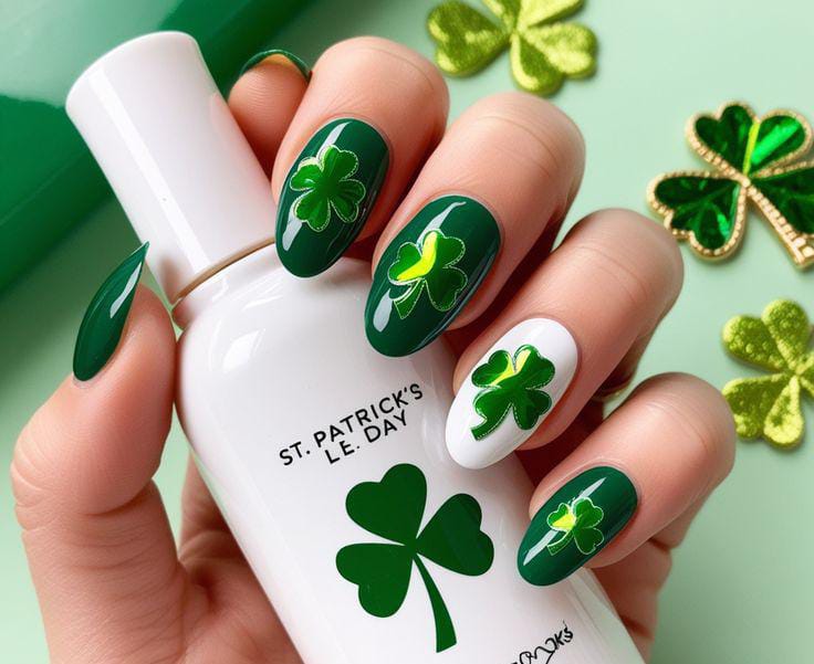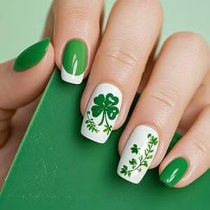Deep green glossy nails paired with white accents and clover designs create a bold St. Patrick’s Day look. The style feels clean and celebratory, with strong lucky-charm energy and a cute finish.
