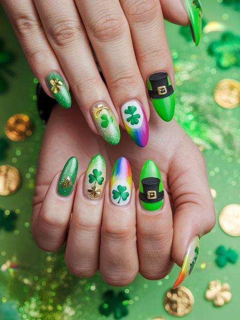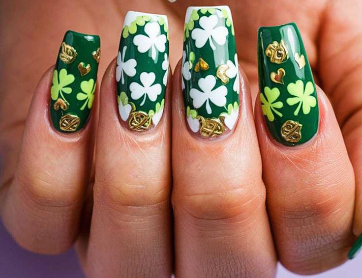 Deep green nails are covered with clovers and tiny gold charms for a bold, decorative look. The design feels rich and festive, giving strong St. Patrick’s Day glam vibes.