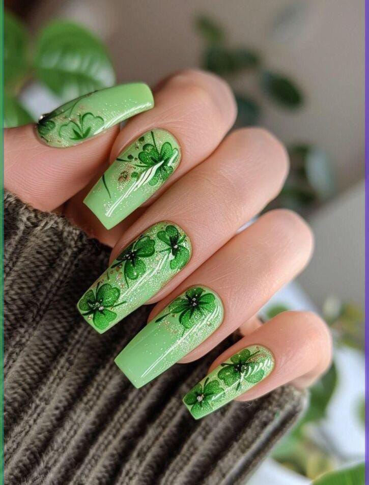 Light green nails with delicate clover art and a soft shimmer create a calm, pretty look. The design feels elegant and fresh while still keeping the St. Patrick’s Day theme cute and cozy.