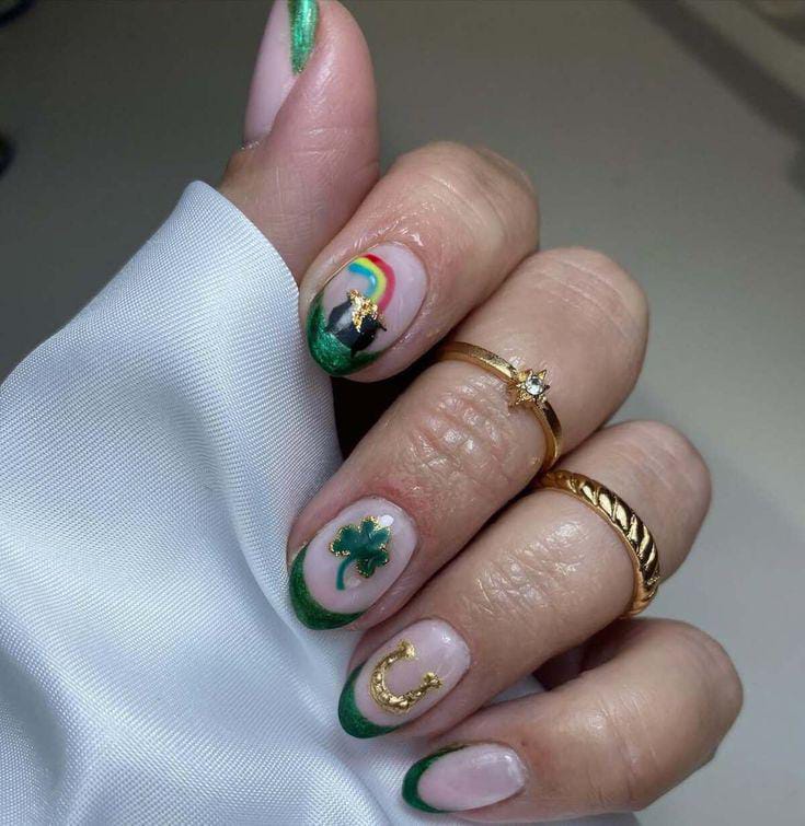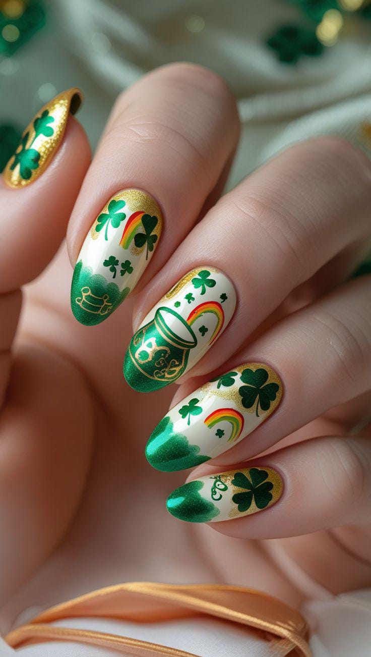 This design mixes soft cream and rich green tip nails with gold accents for a festive, elegant look. Shamrocks, rainbows, and a pot of gold give it a playful St. Patrick’s Day vibe without feeling over-the-top.
