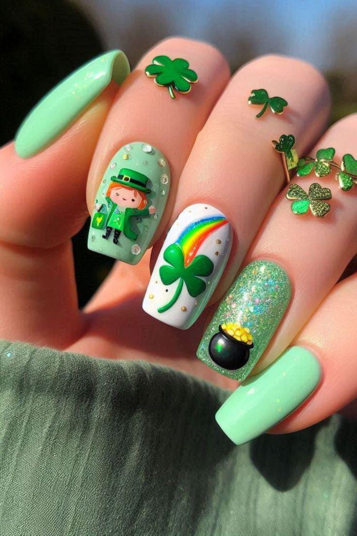 This design mixes soft mint, glitter and white nails with playful St. Patrick’s Day icons like shamrocks, rainbows, rhinestones, dots, gold pots of coins and a little leprechaun character. It feels cheerful, cute, and a bit whimsical with a light, springtime vibe.