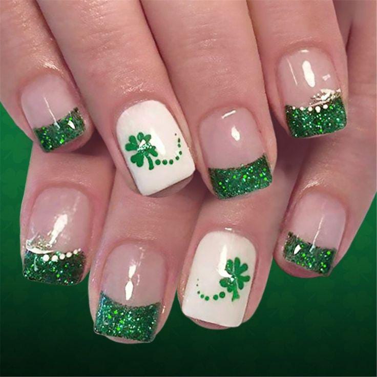 This design mixes deep green and sparkling glitter nails with cute shamrock white accents. The overall vibe is festive, bold, and perfect for St. Patrick’s Day celebrations.