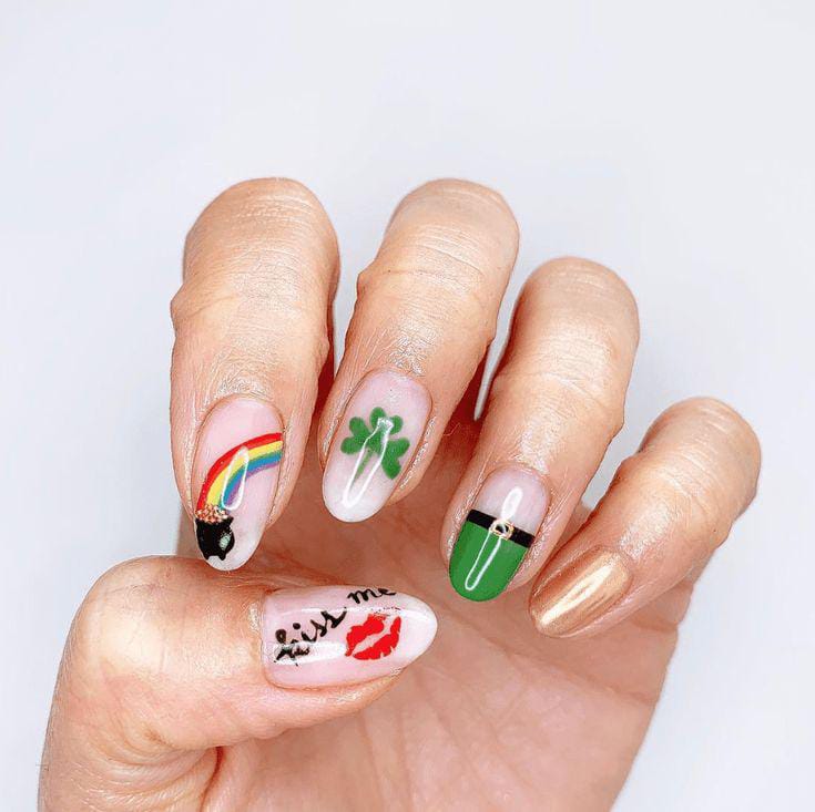 This playful design combines rainbows, clovers, green tips, and a fun kiss accent for a cheeky St. Patrick’s holiday feel. The mix of nude space and bright green makes it look modern and trendy.