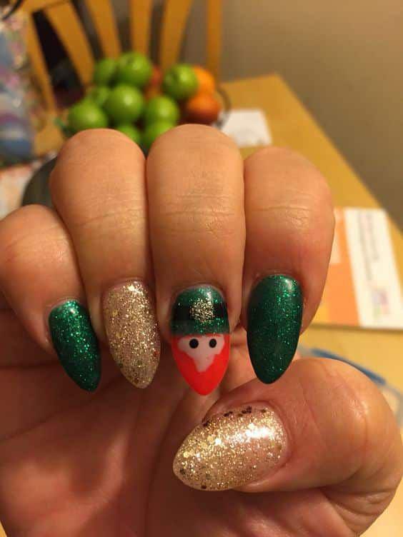 Deep green glitter nails are paired with gold sparkles and a fun little St. Patrick’s character accent. The style feels festive and bold, with a cute holiday charm and party-ready sparkle.