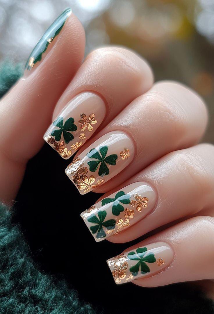 Soft nude nails are decorated with green clovers and delicate gold foil clover accents. The overall style feels classy and delicate, with a pretty, magical St. Patrick’s Day aesthetic.