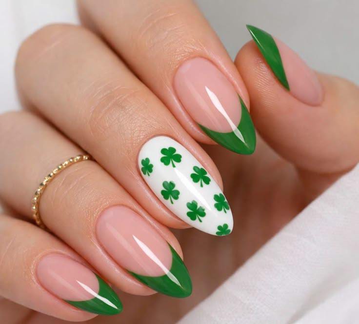 This look is nude nails with sharp green French tips and tiny shamrock details on white accent nail. The style is clean, cute, and St. Patrick’s Day festive without being too loud.