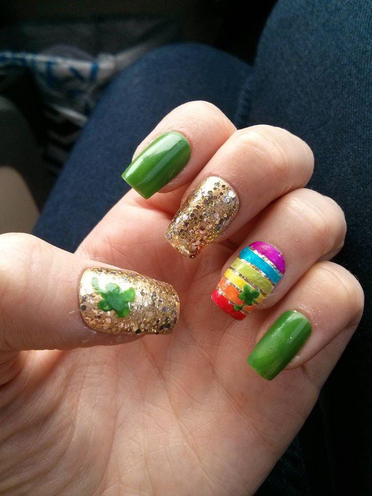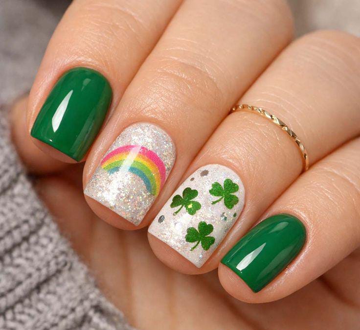 This design soft green nails with gold glitter and a colorful rainbow accent for a fun St. Patrick’s holiday vibe. The little shamrock details give it that lucky charm without looking overdone.