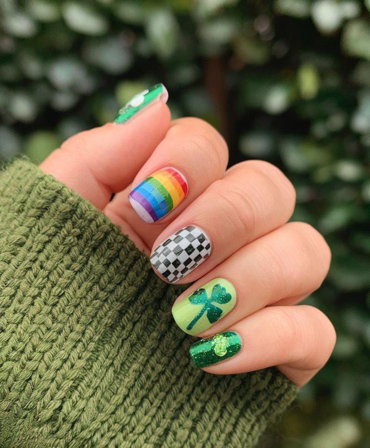 These nails combine soft green and glitter nails with fun accent designs, including a bright rainbow and a checkered pattern. The look feels cheerful, quirky, and lighthearted St. Patrick’s day.