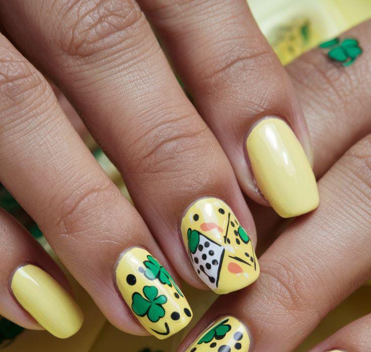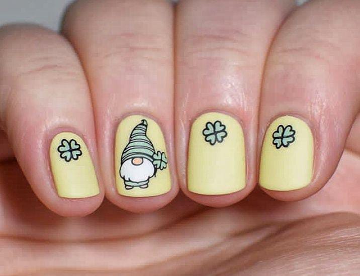 Soft pastel yellow nails are paired with cute gnome and clover art for a cozy, whimsical feel. The design looks sweet and cheerful, perfect for a lighthearted St. Patrick’s Day style.