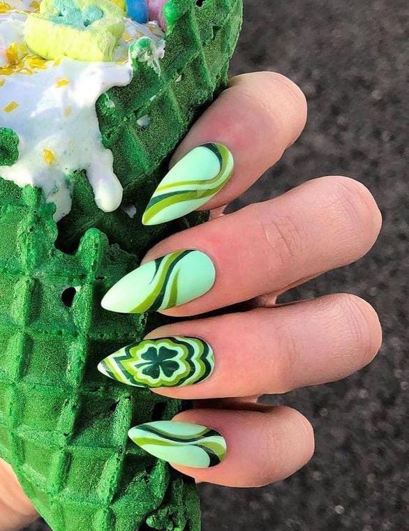 These nails feature soft mint and green tones with flowing swirl patterns and a clover accent. The style feels modern and artsy with a fresh, springtime St. Patrick’s day vibe.