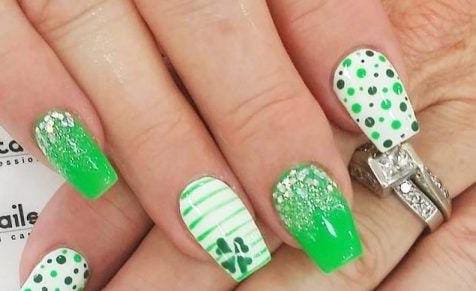 This design mixes bright green and white nails with polka dots, stripes, glitter accents, and tiny shamrocks. The overall vibe is playful and festive, with a fun mix-and-match St. Patrick’s Day look.