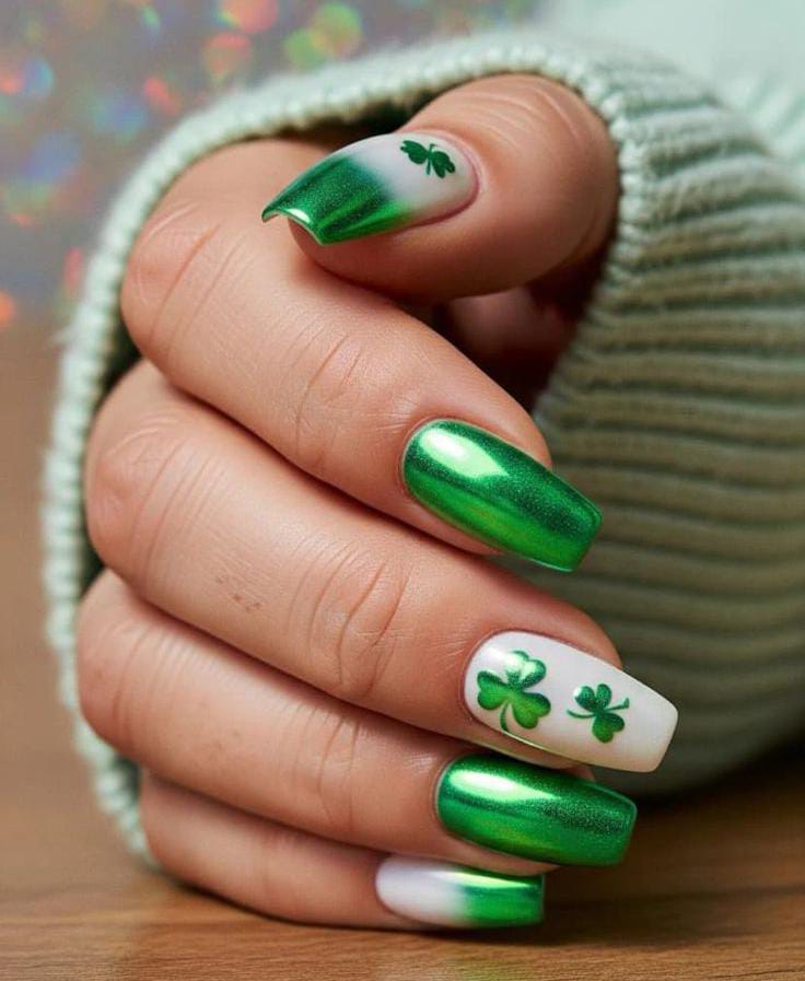 Shiny emerald green chrome nails are paired with soft white bases and tiny clover accents. The style feels bold and glam while still keeping the festive St. Patrick’s Day theme.