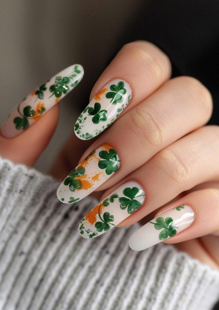 These nails mix soft green tip and white tones with minimal shamrock and leaf patterns. The style feels fresh and modern, perfect for a cute but subtle St. Patrick’s holiday manicure.