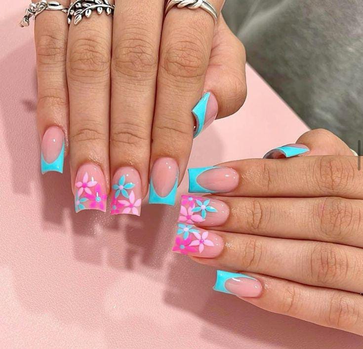 This design has a bright, playful summer feel with vivid blue French tips paired with soft floral nude pink accents nails. The mix of bold color and delicate flowers creates a fun, beachy look that feels fresh and cheerful.